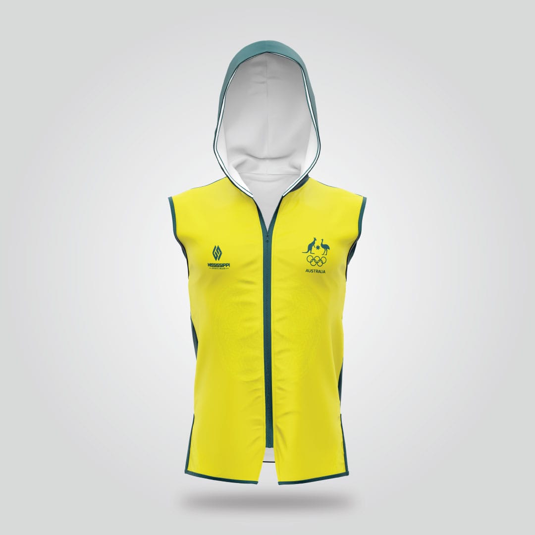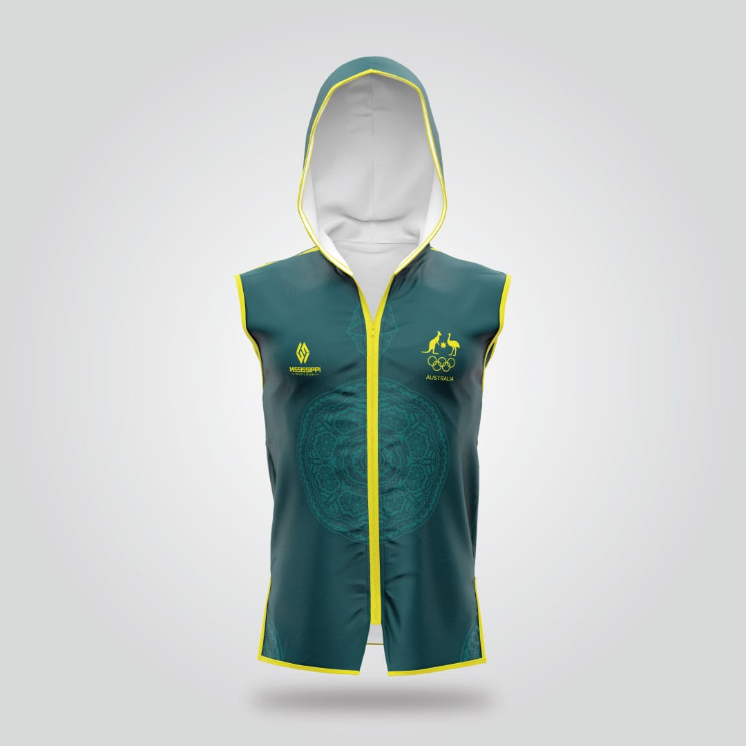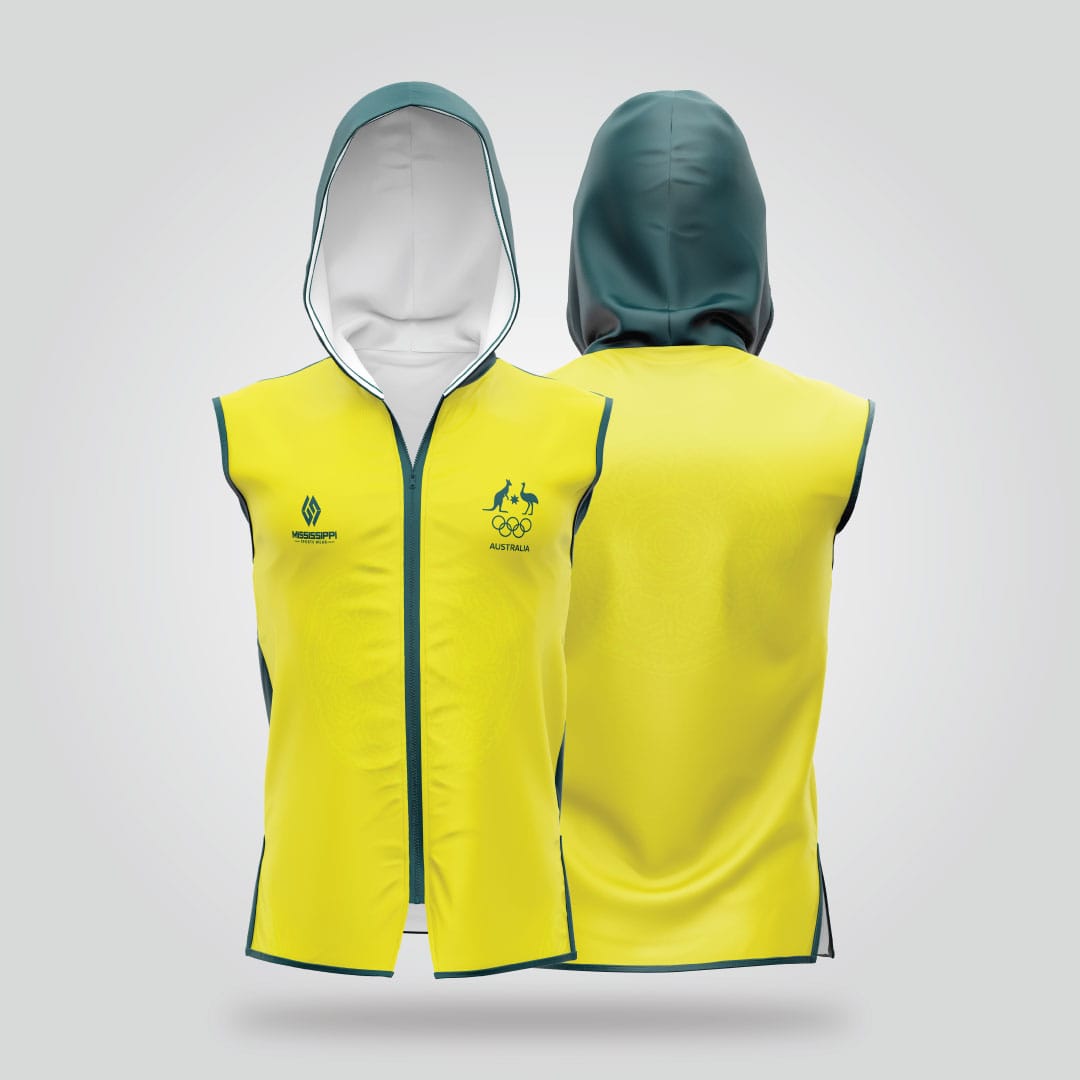 The Australia Boxing Jacket is designed for champions who carry their nation’s spirit into every fight. Crafted for comfort, movement, and pride, this sleeveless boxing jacket captures the energy of Australia’s sporting excellence. Featuring the iconic kangaroo and emu Olympic symbols on the chest, this jacket represents determination, teamwork, and elite performance. The combination of green and gold accents embodies Australia’s national identity while keeping your look sharp and powerful.
